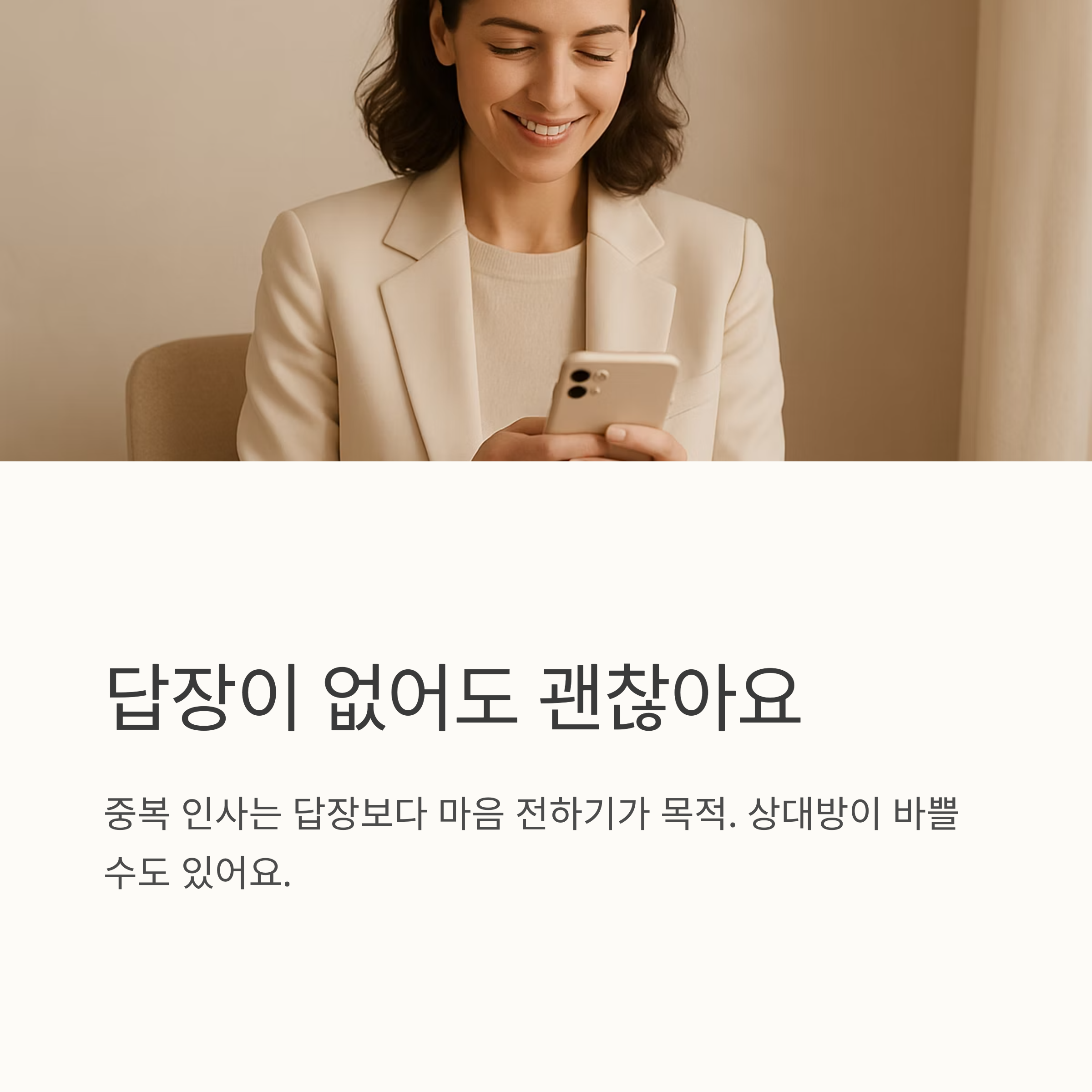 문자, 카카오톡, 메신저 등 다양한 채널에 활용 가능하며, 상황에 따라 말투나 톤을 살짝 바꿔서 응용해 보세요.