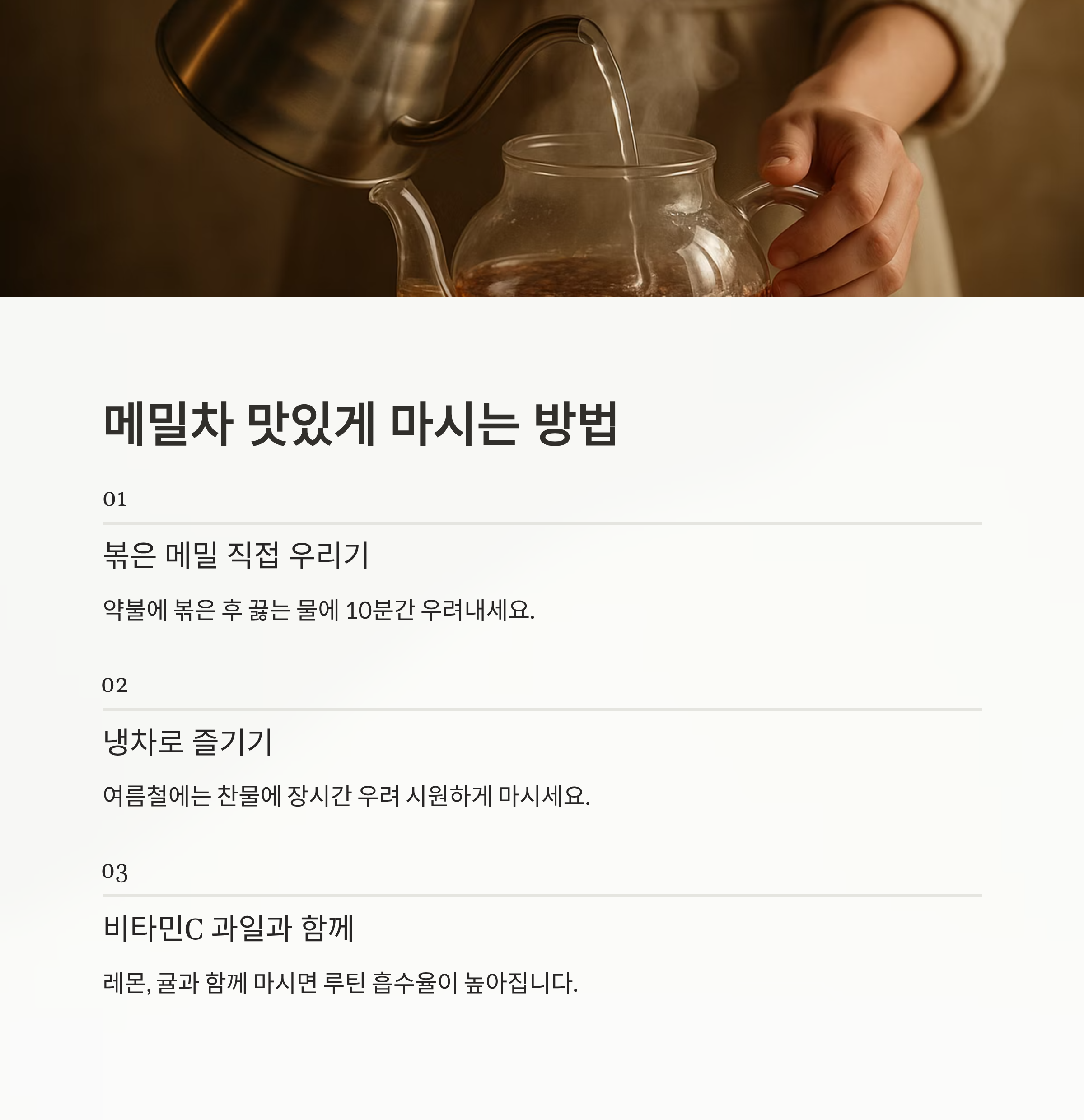 이번 글에서는 메밀차 효능 부작용부터 조심해야 할 대상, 효과적으로 마시는 방법, 추천 음용 시간대까지