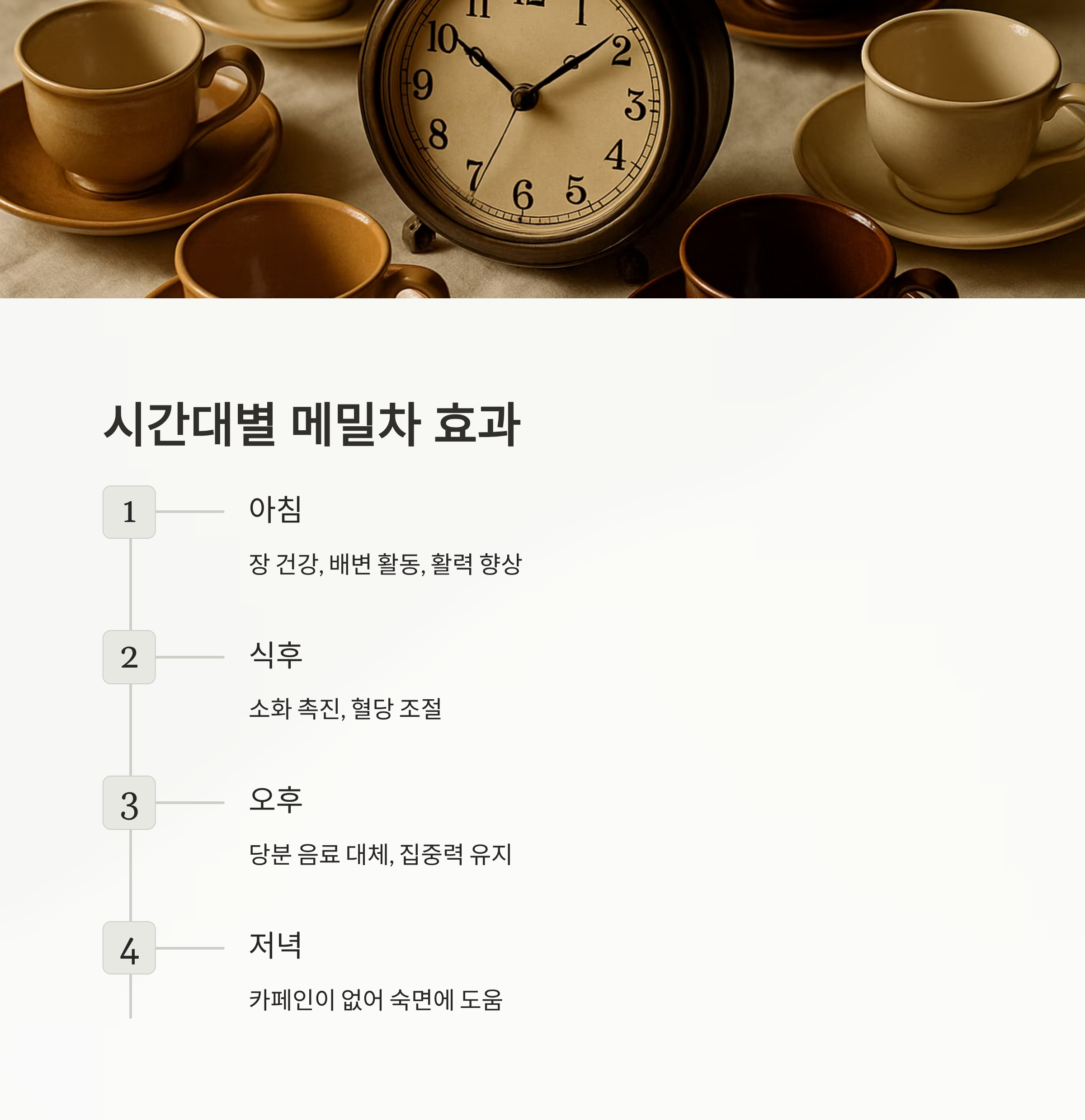 메밀차는 카페인이 없어 언제든지 마실 수 있지만, 시간대별로 다른 효과를 기대할 수 있습니다.