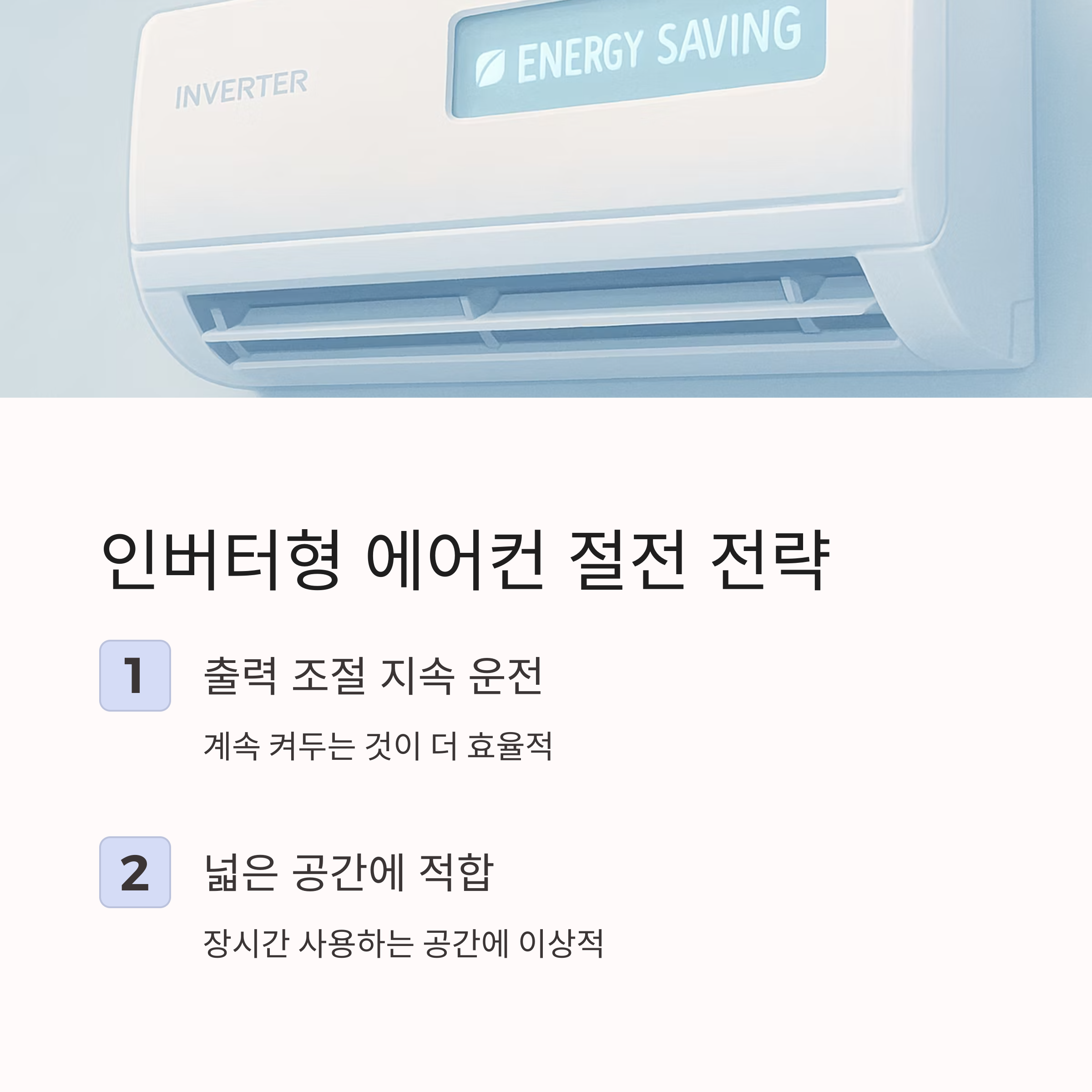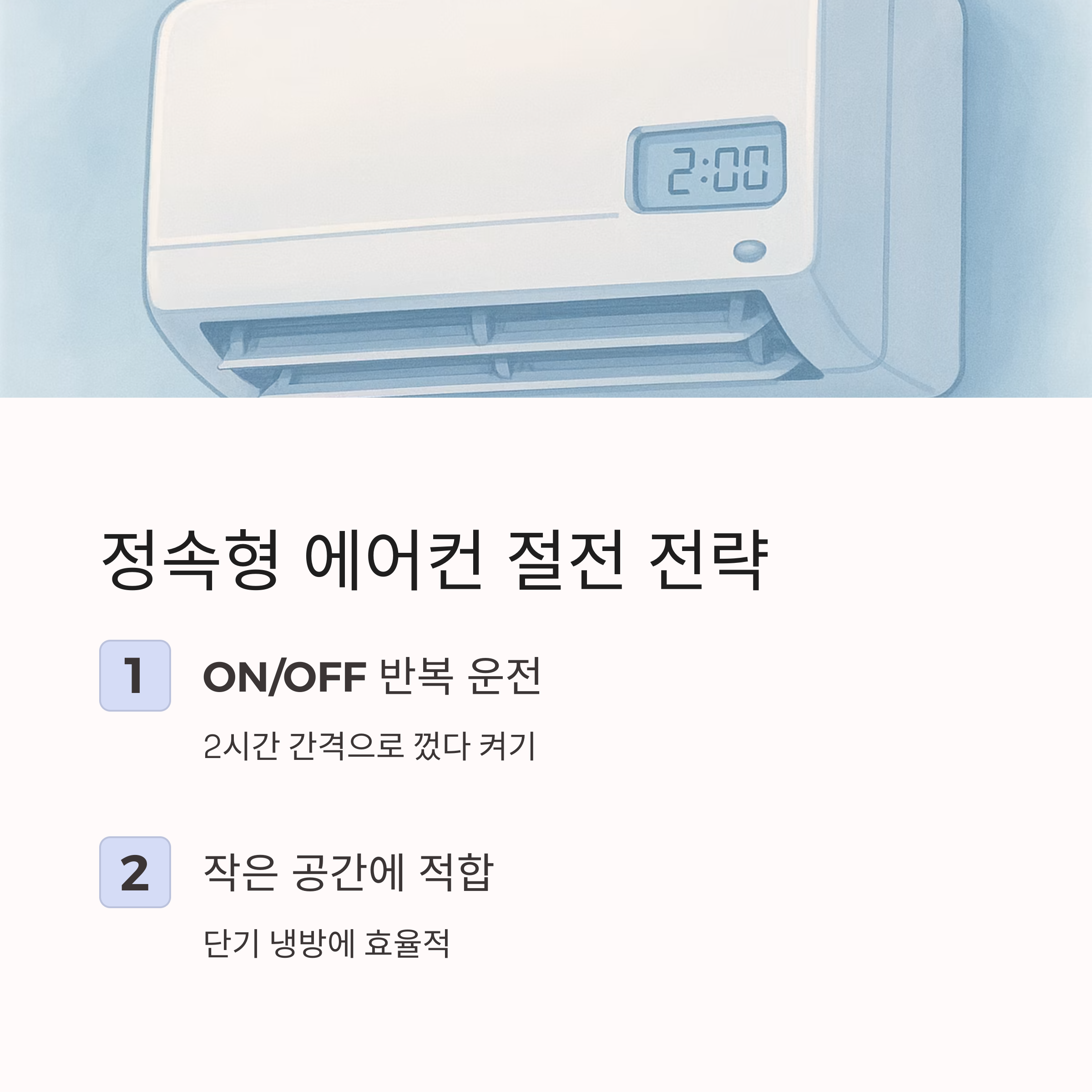 인버터형은 연속 운전이 유리하고, 정속형은 필요할 때만 단시간 사용하는 것이 절전의 핵심입니다.