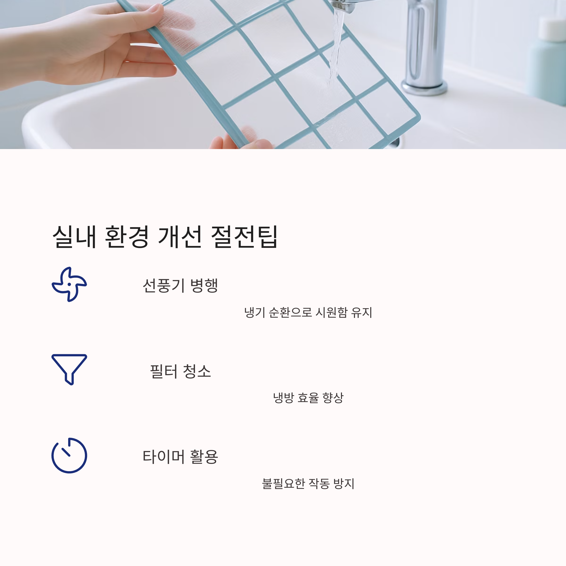 선풍기와의 병행 사용과 에어컨 필터 관리는 냉방 효율을 크게 향상시킵니다.