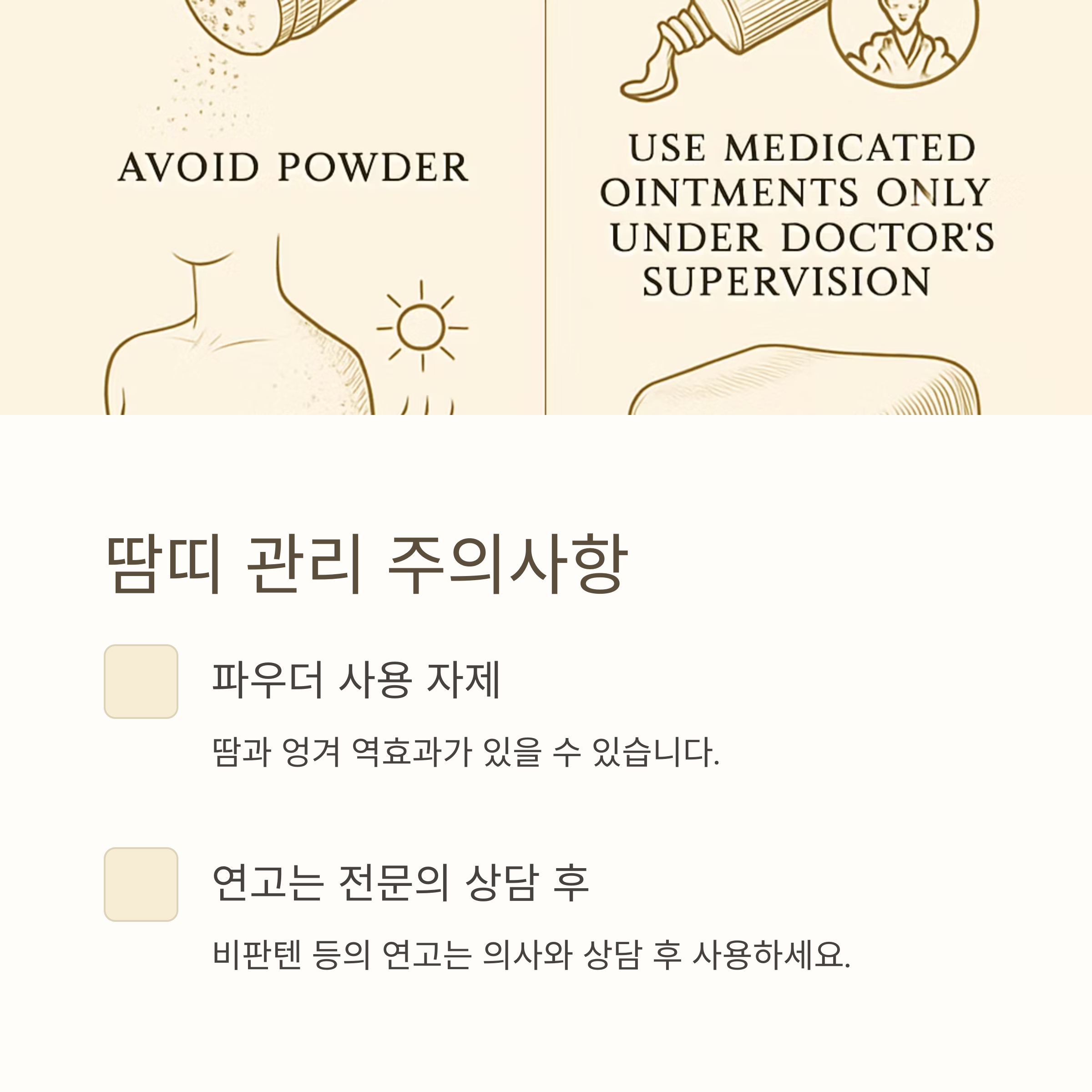 - 파우더는 땀과 엉겨 역효과가 있으므로 자제