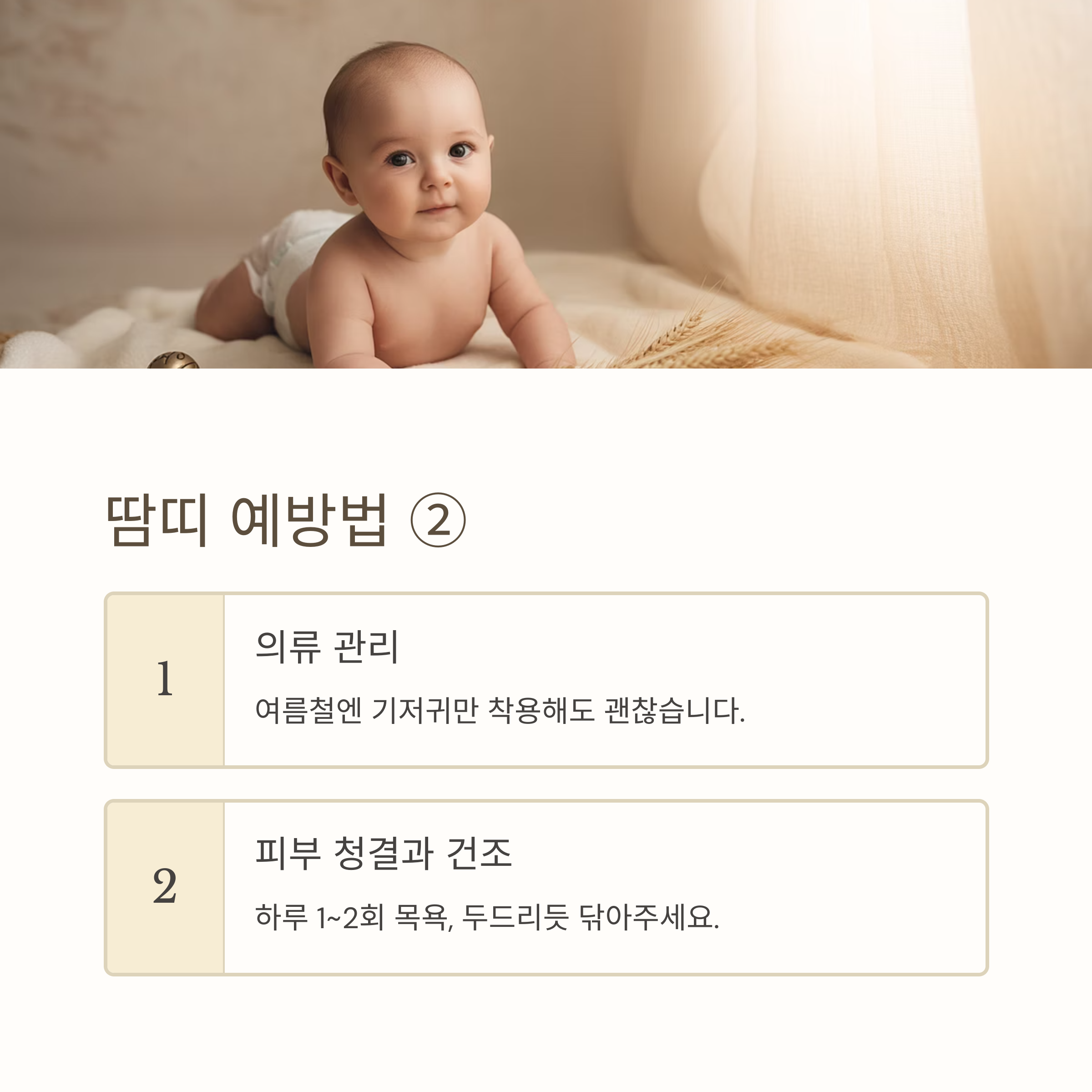 일상적인 환경 관리와 피부 케어 습관이 땀띠 예방의 핵심입니다.