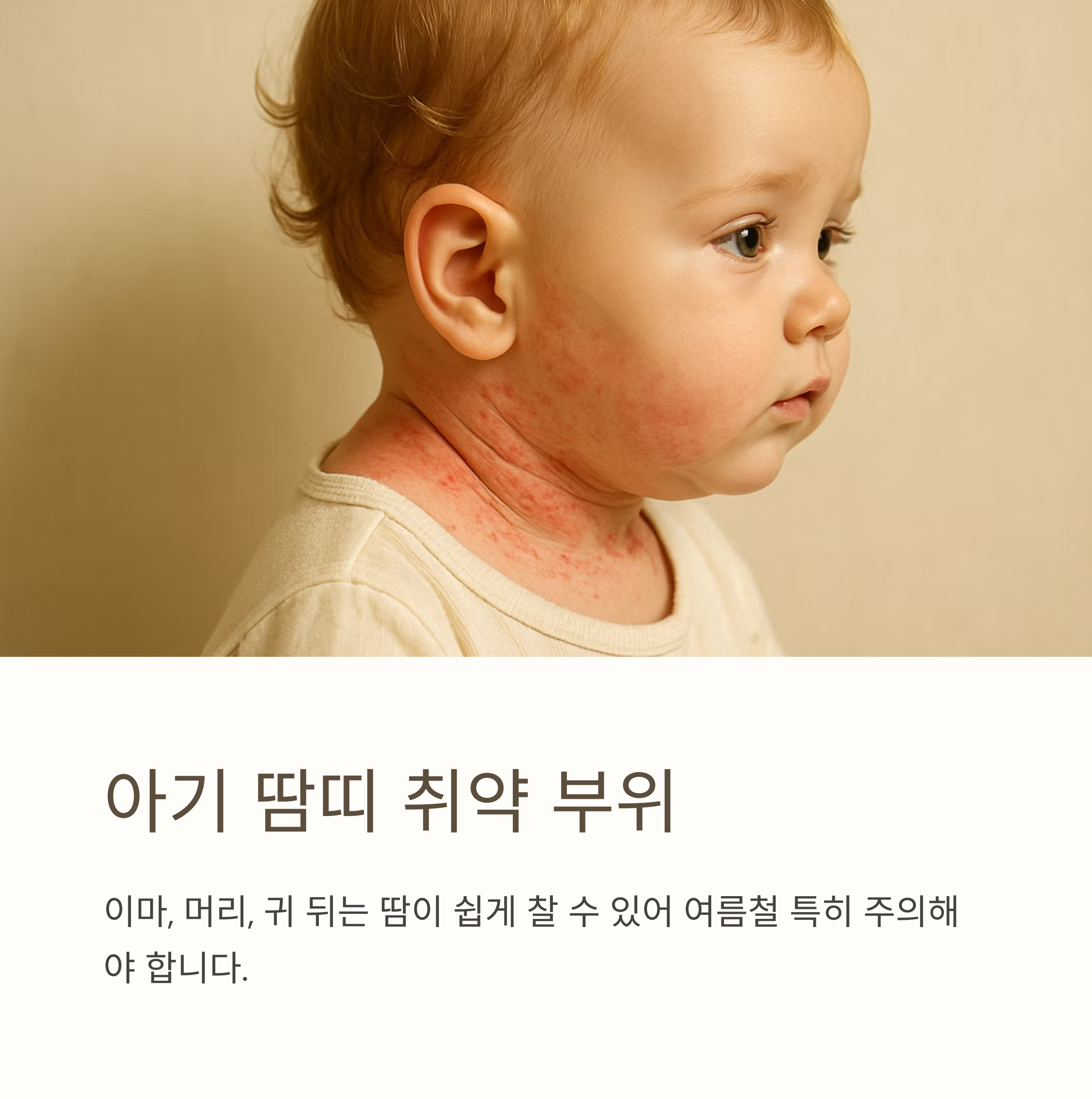 | 이마, 머리, 귀 뒤 | 땀이 쉽게 찰 수 있는 부위, 특히 여름철 주의 |