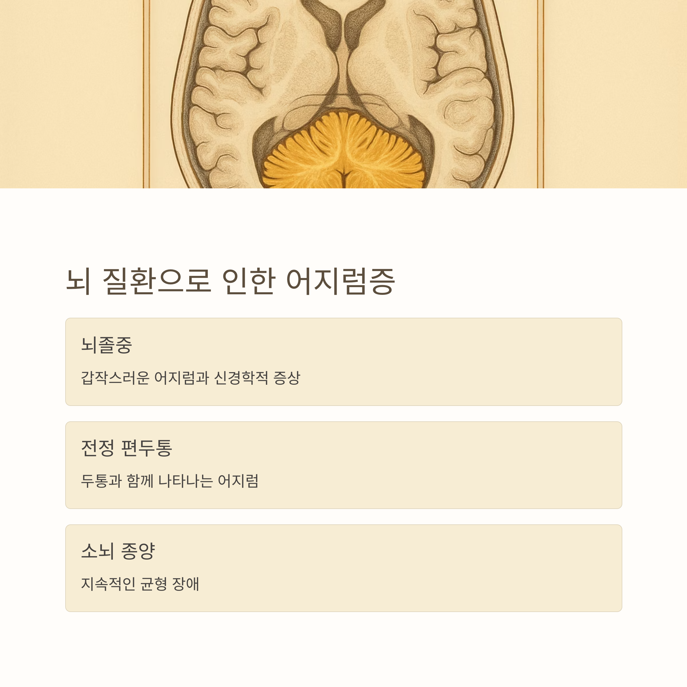 | 뇌 질환 | 뇌졸중, 전정 편두통, 소뇌 종양 등 |
