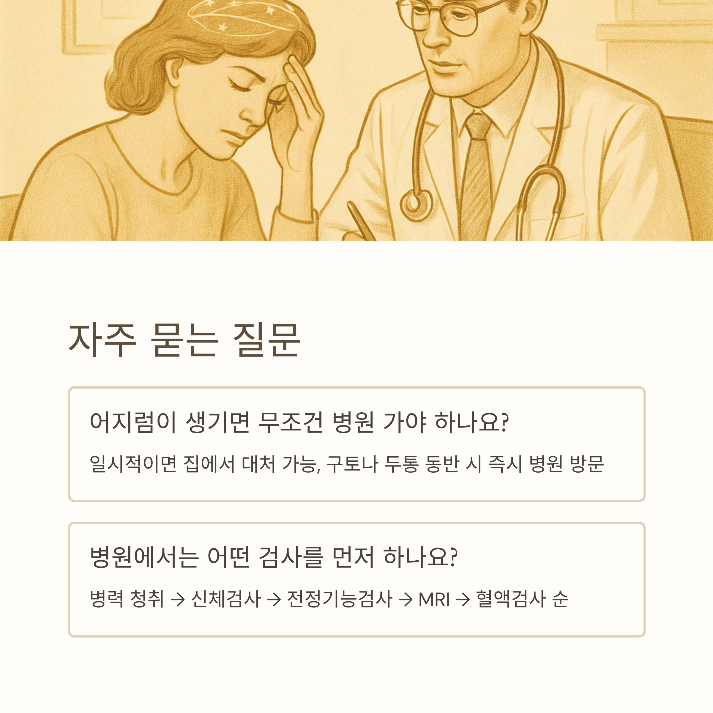 오늘은 머리가 어지러운 증상의 원인부터 집에서 대처할 수 있는 방법, 증상이 계속될 때 반드시 받아야 할 검사까지