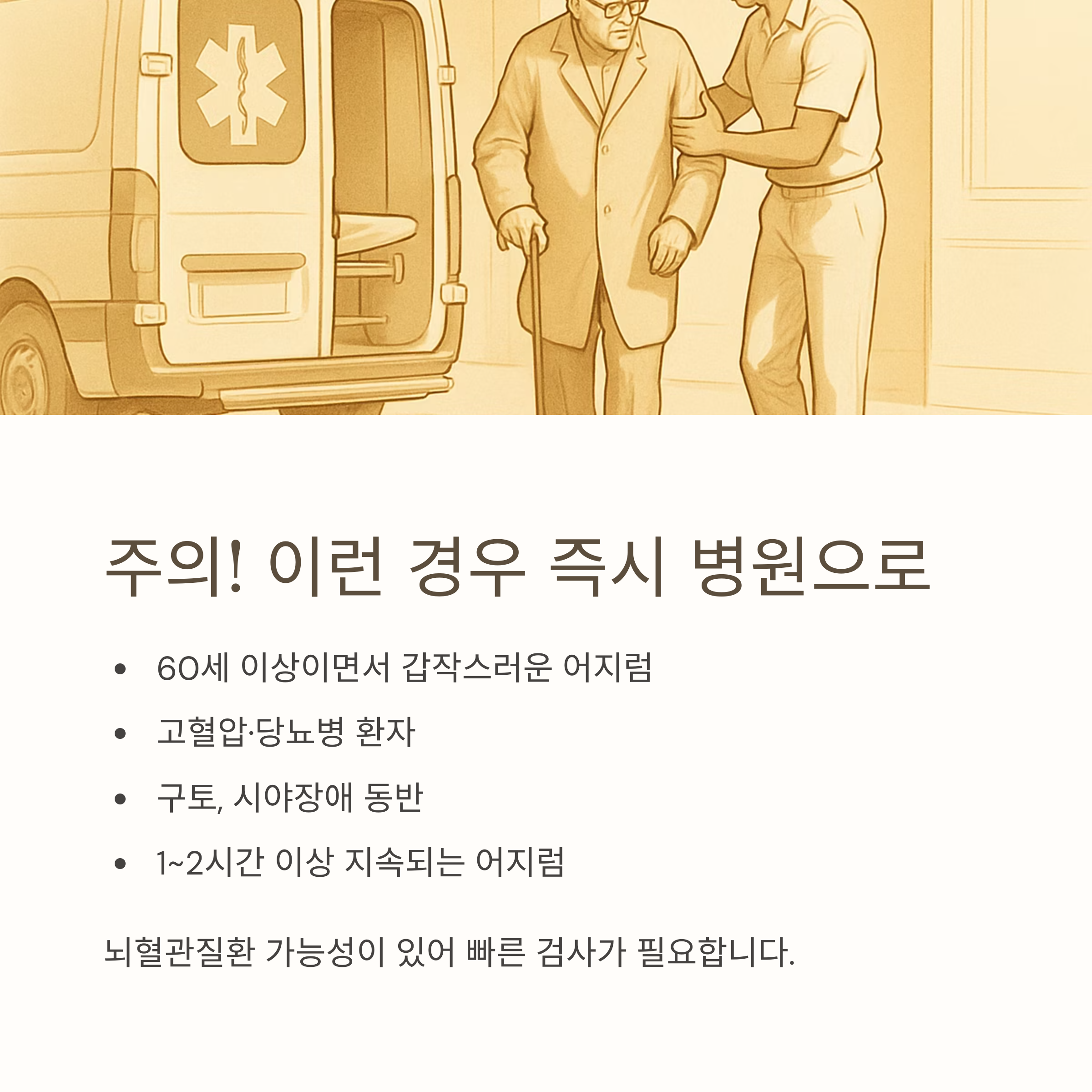특히 60세 이상이거나 고혈압·당뇨병이 있는 분은 뇌혈관질환 가능성을 염두에 두고 빠른 검사가 필요합니다.