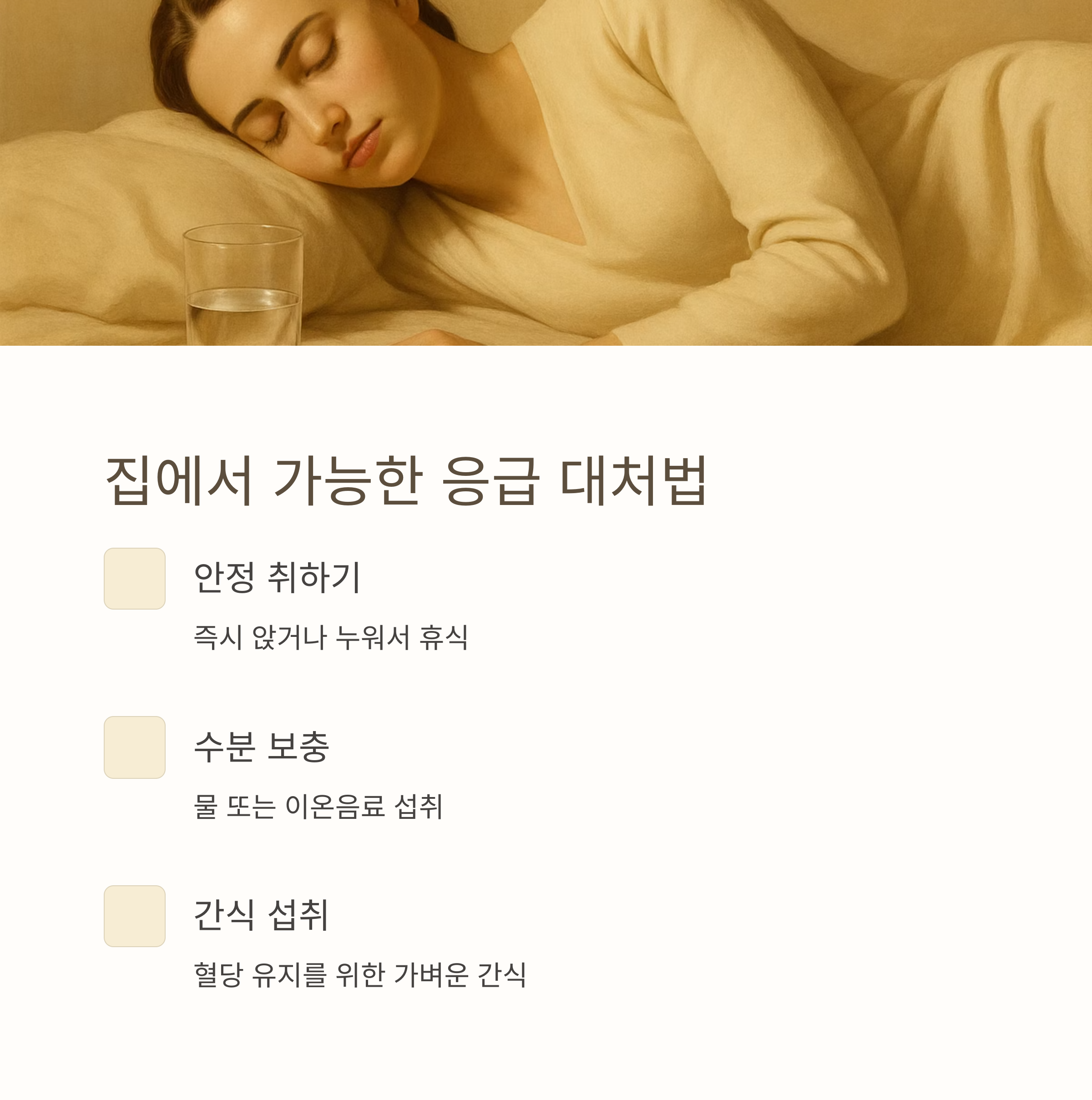 - 즉시 앉거나 누워 안정 취하기