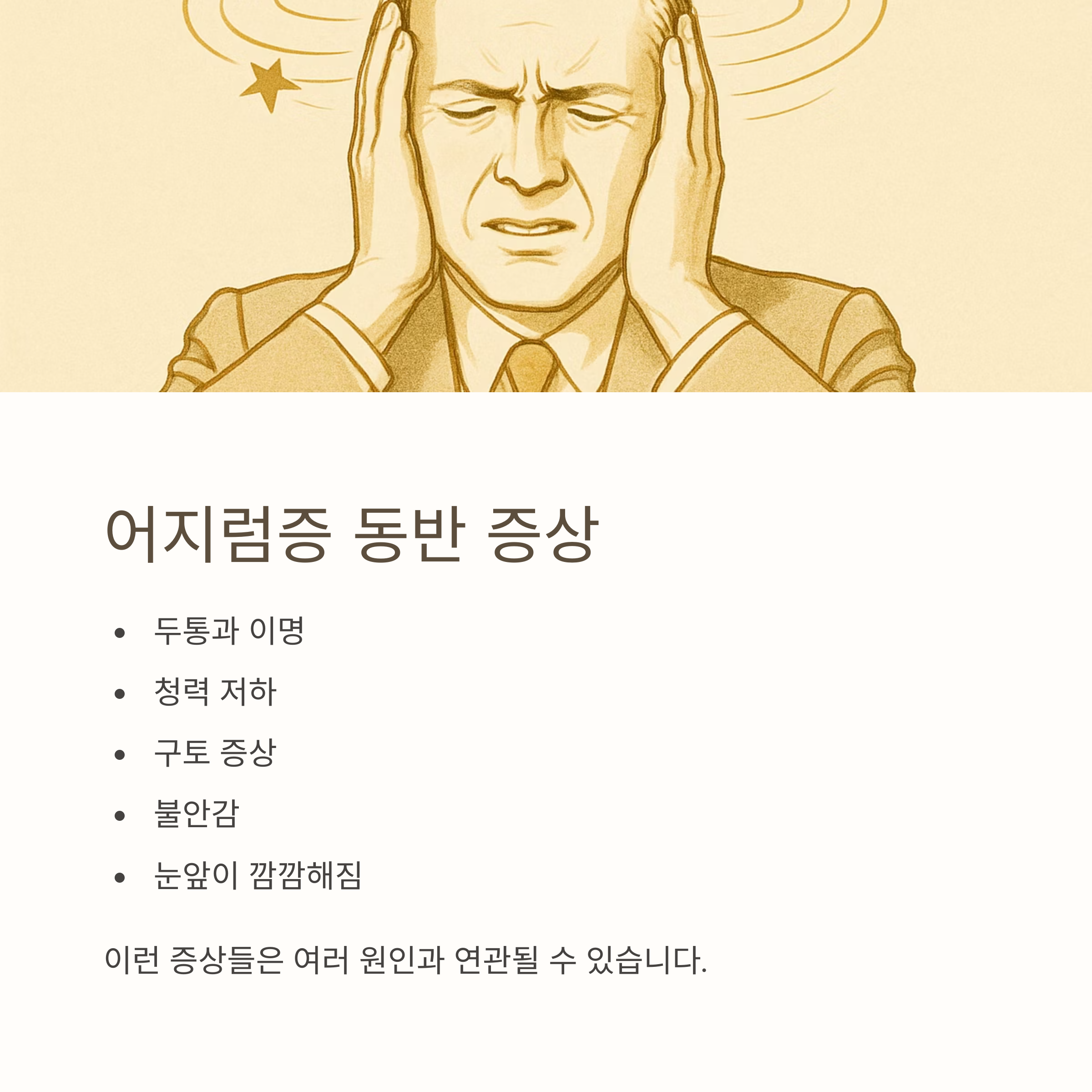 - 동반 증상: 두통, 이명, 청력 저하, 구토, 불안감 등