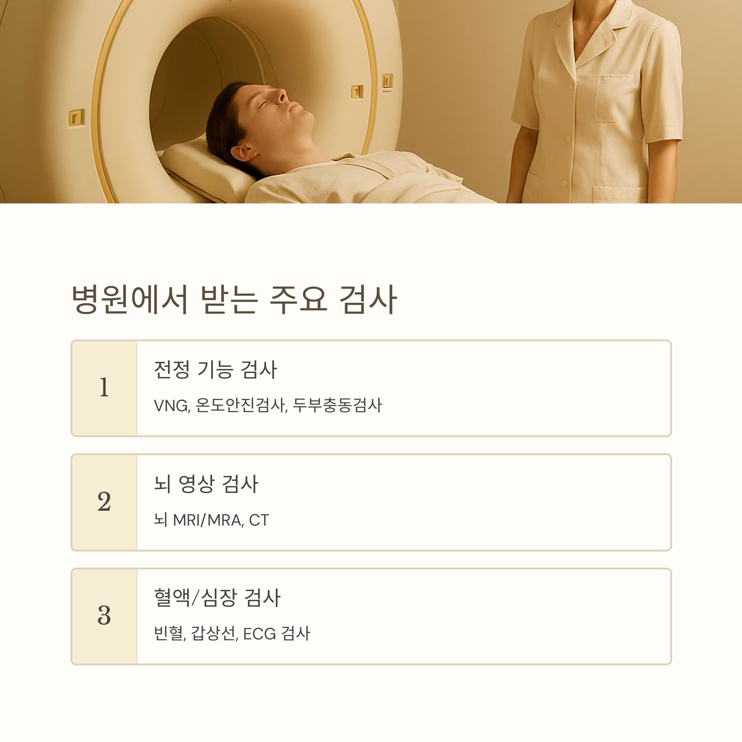 머리가 어지러운 증상이 반복되거나 심각할 경우, 병원에서는 아래와 같은 정밀검사를 시행합니다.