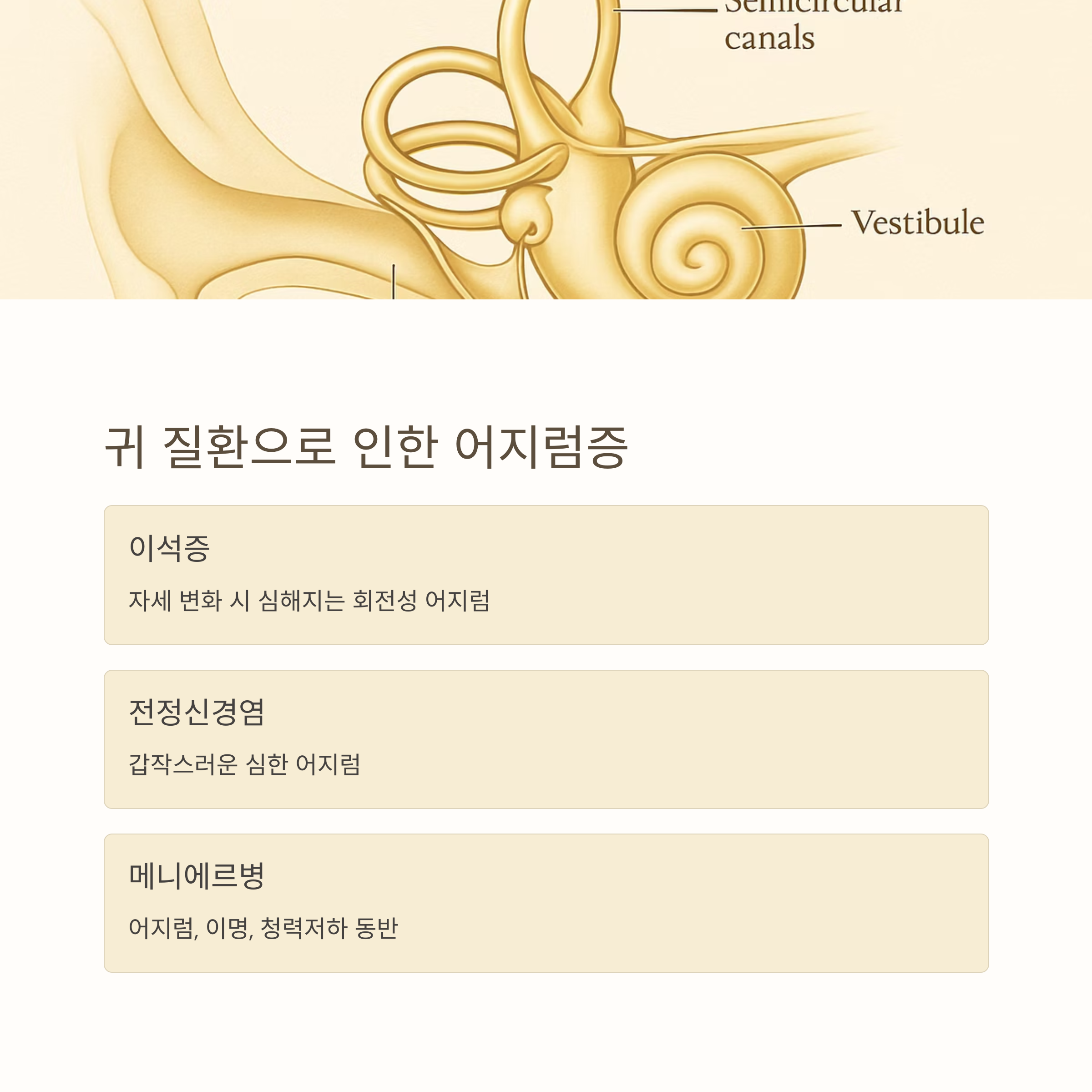 | 귀 질환 | 이석증, 전정신경염, 메니에르병 등 |
